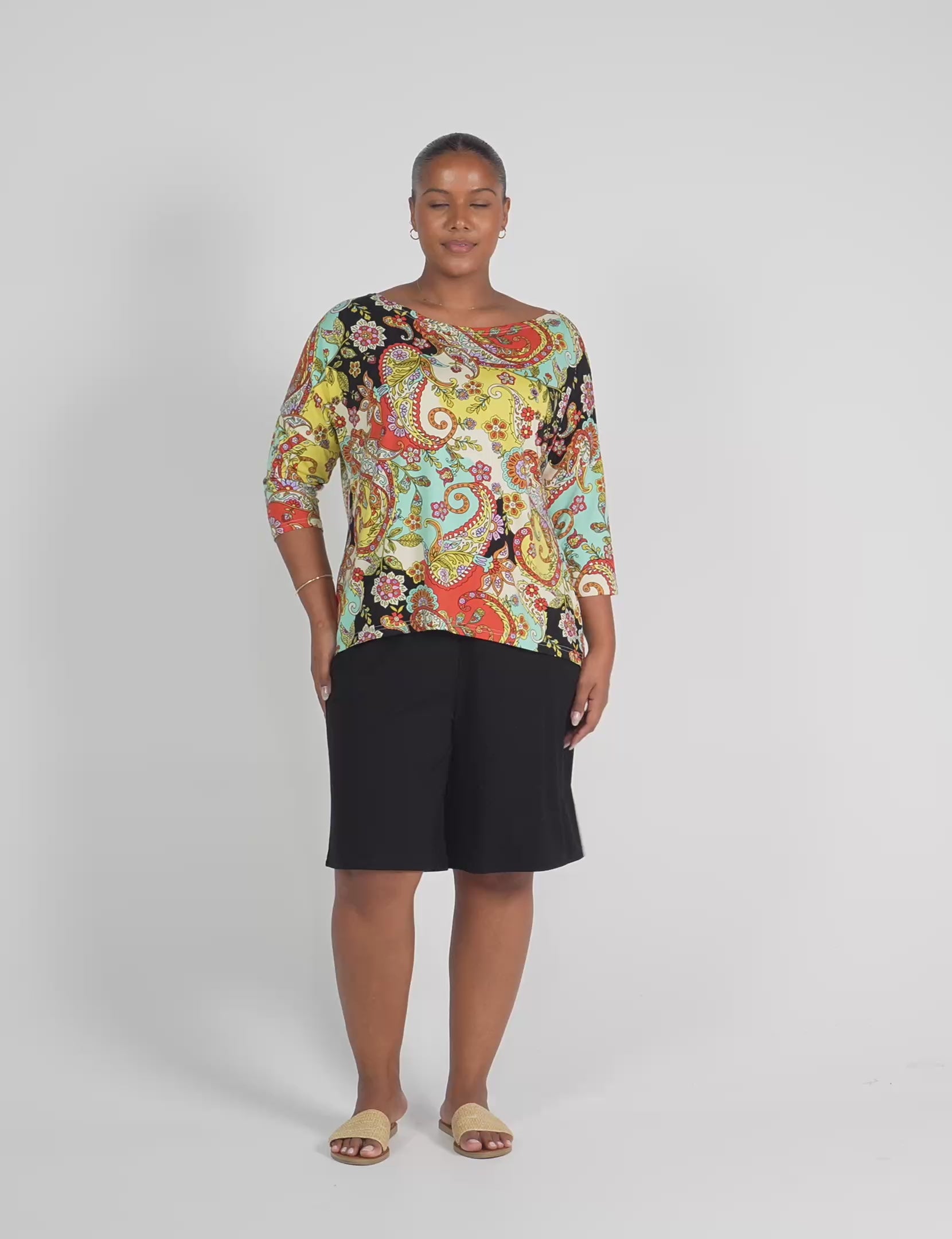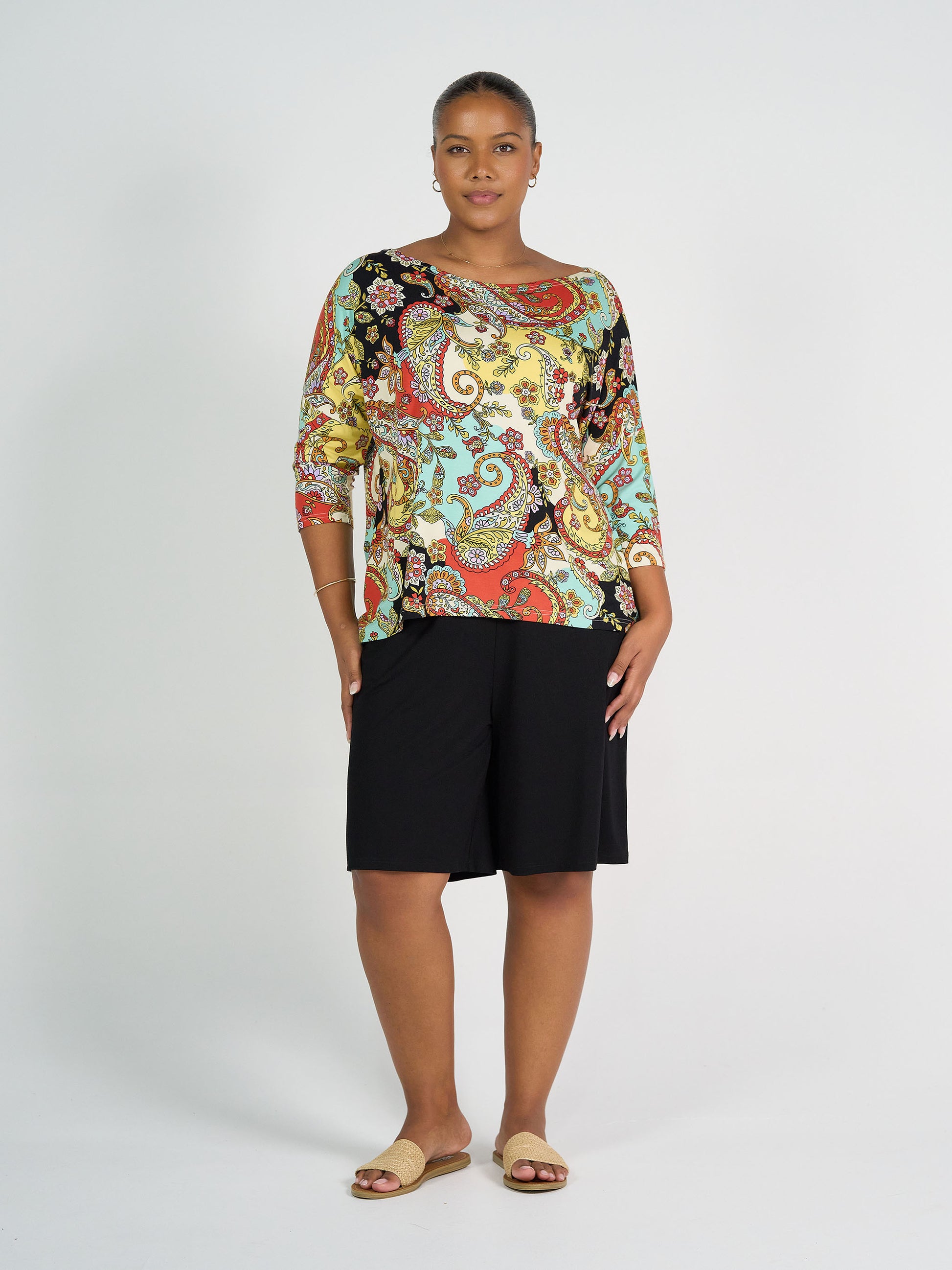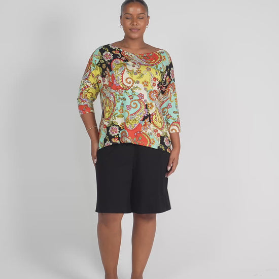 The Camila Top is a lovely, stretchy style made with our signature, luxuriously soft bamboo fabric. This top is simple and stylish. A relaxed box fit falling to the hip. Featuring a boatneck, 3/4 sleeve and gentle curved hem at back. This versatile top is made to flatter not too loose and not too tight.