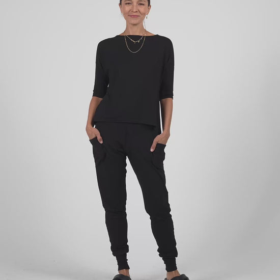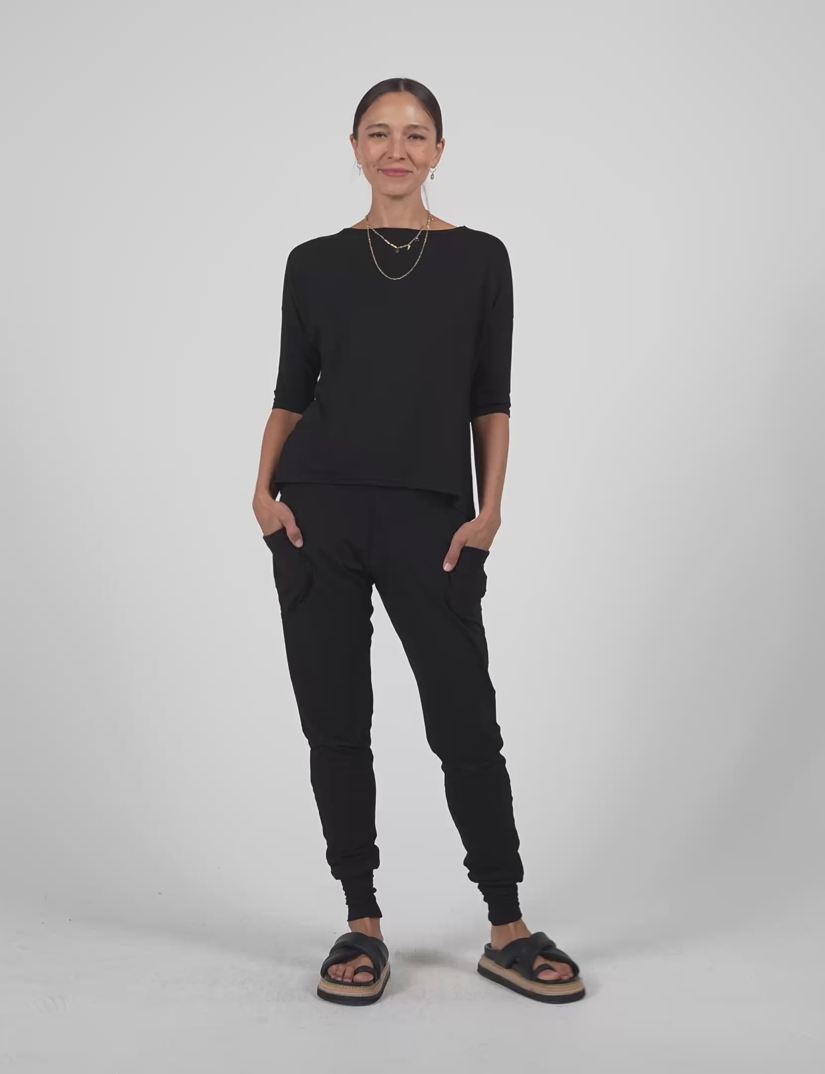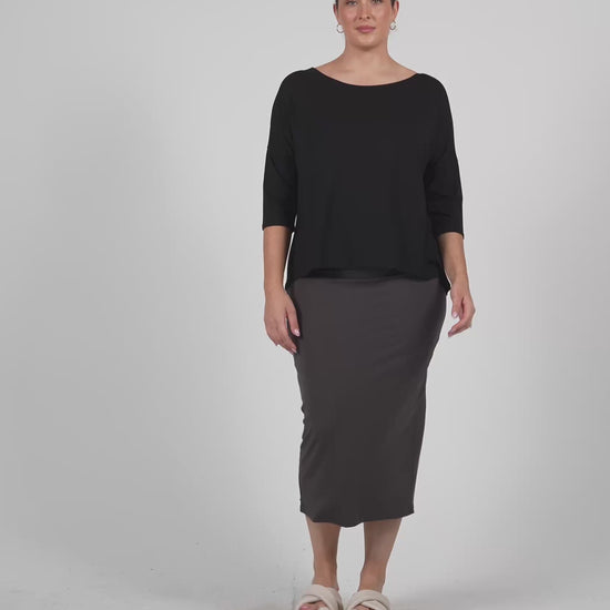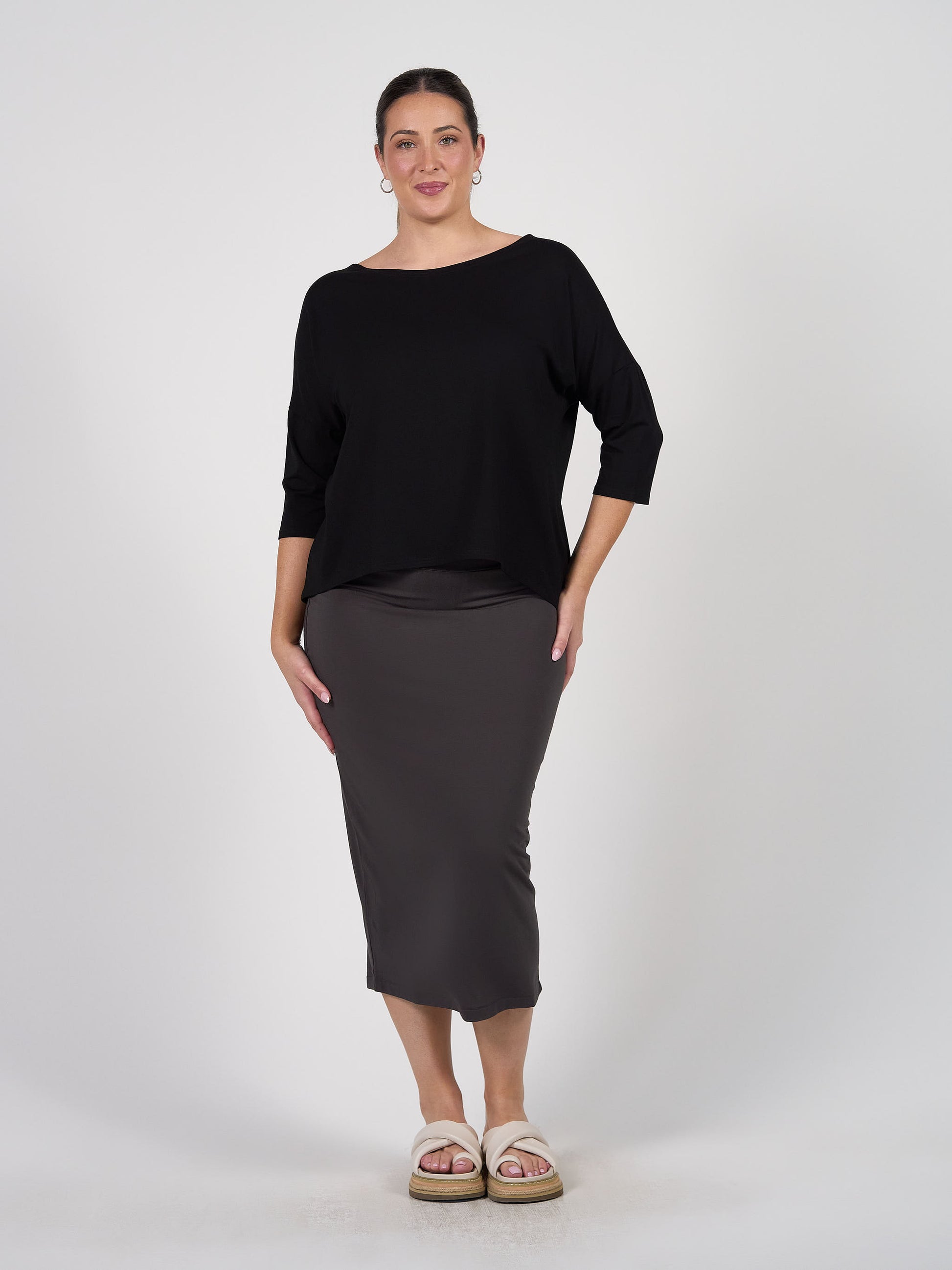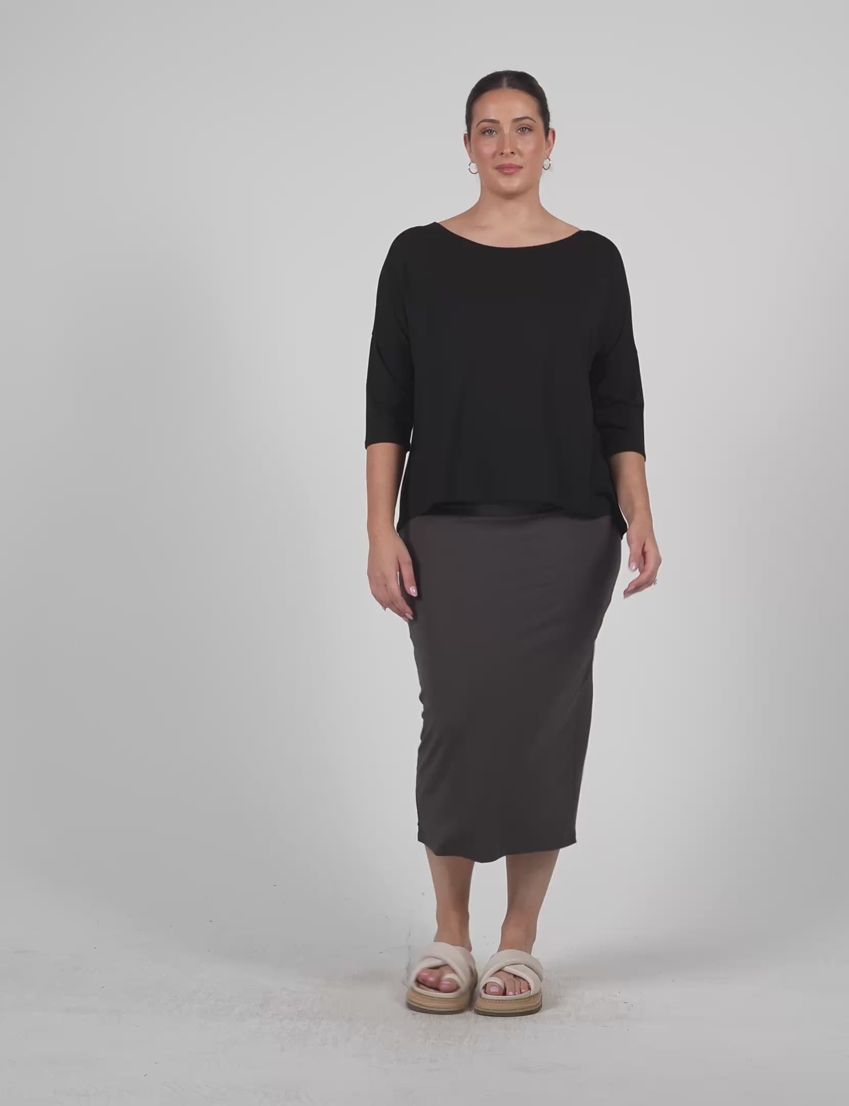 The Camila Top is a lovely, stretchy style made with our signature, luxuriously soft bamboo fabric. This top is simple and stylish. A relaxed box fit falling to the hip. Featuring a boatneck, 3/4 sleeve and gentle curved hem at back. This versatile top is made to flatter not too loose and not too tight.