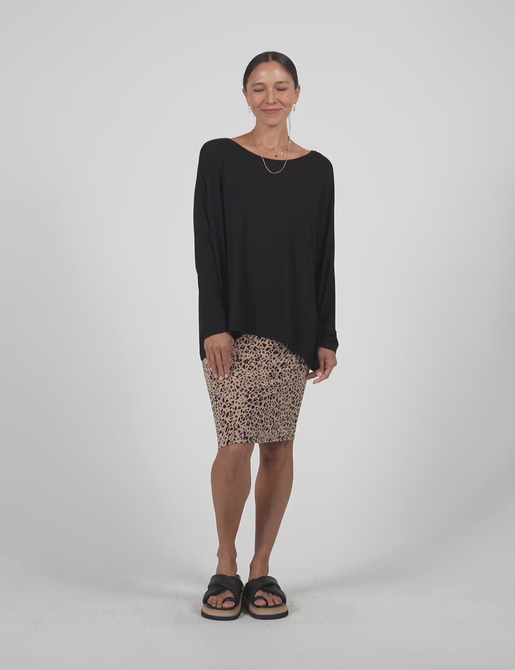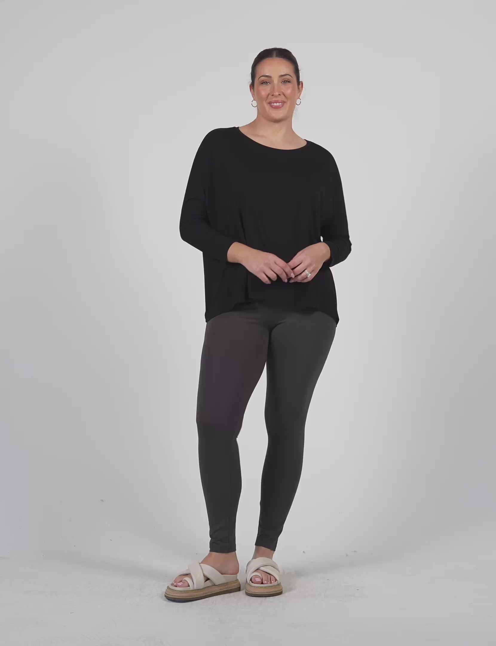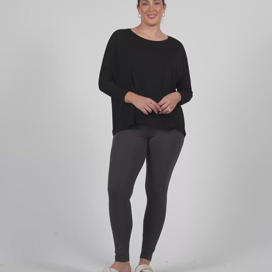 Versatile go-to oversized bamboo tee that feels heavenly against your skin. Featuring a relaxed draped fit with round crew neck this tee is hip length with full length sleeves.