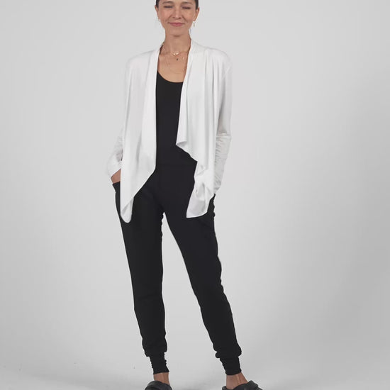 Our modern Bamboo cardigan/jacket is perfect for every season. Featuring a waterfall front, fitted sleeves and a hook closure at the shoulder so you can wear as a top! Such a versatile wardrobe essential!
