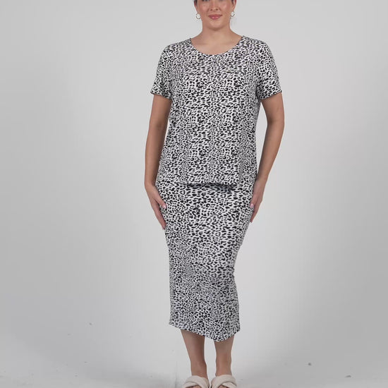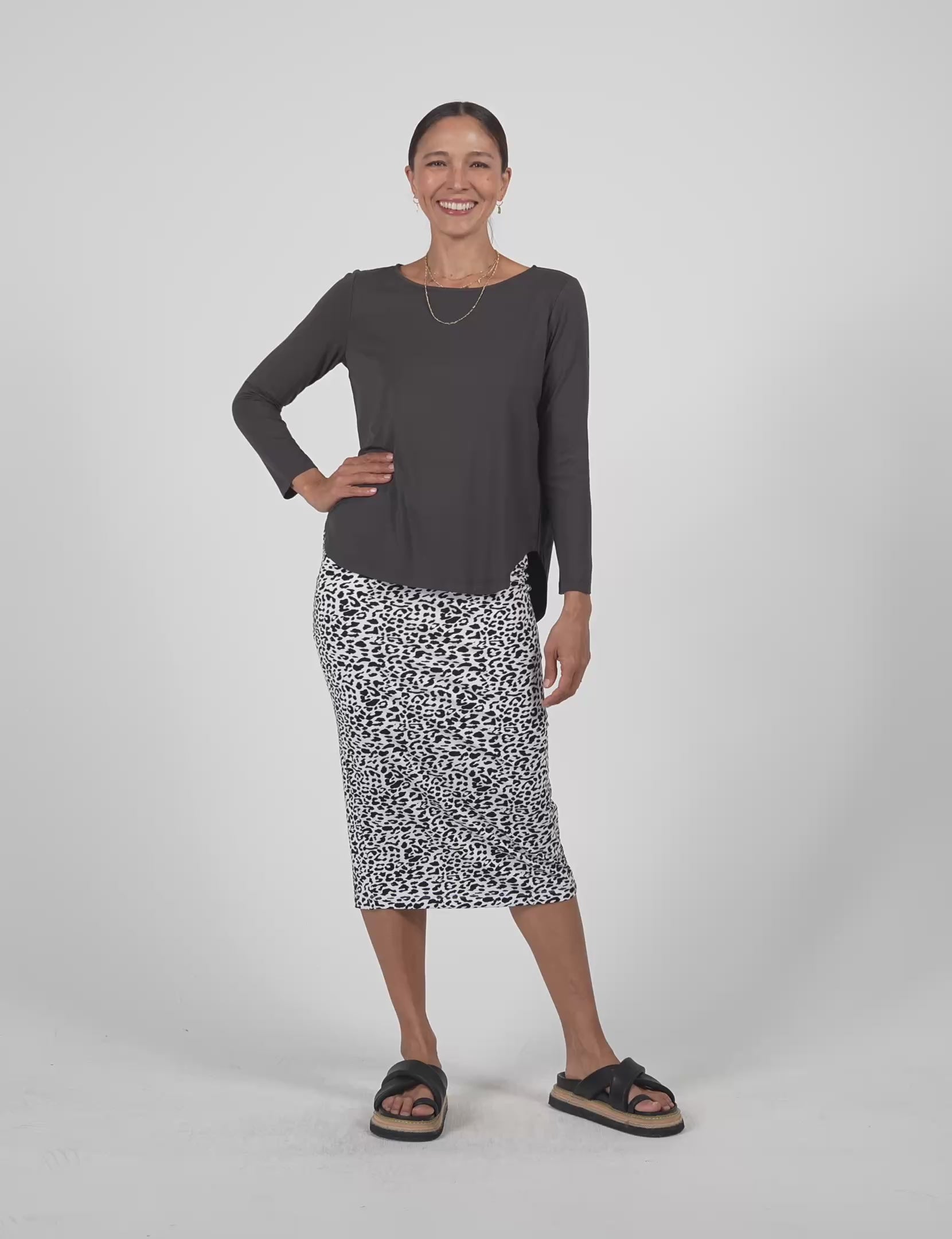 This skirt is ideal for the 9-5, wear with a tucked in shirt, tee or long sleeve top for the smart, work ready look. Or for a casual look, slip on with the Janis Bamboo Tee and your favourite joggers. Also available in mid length.