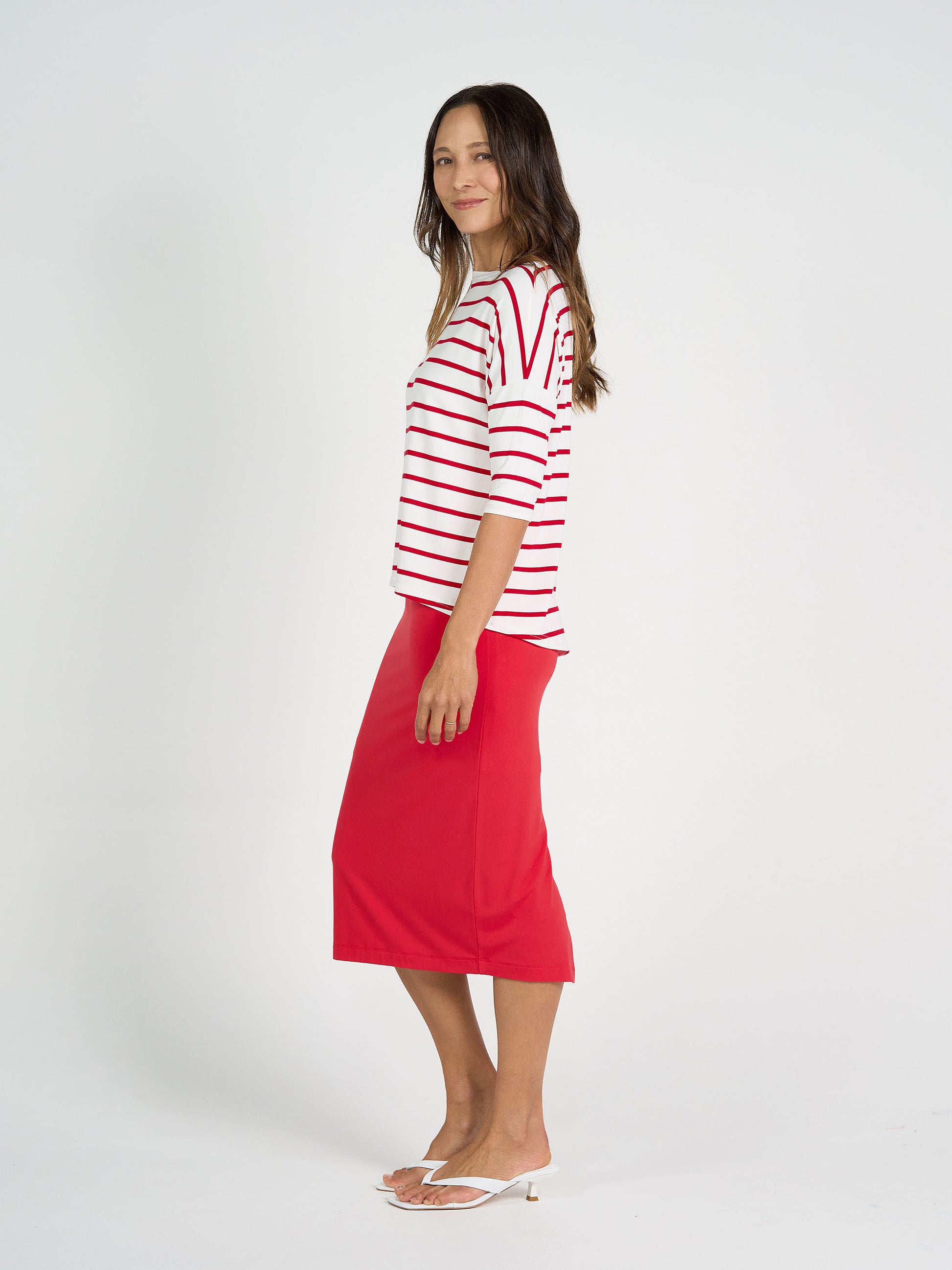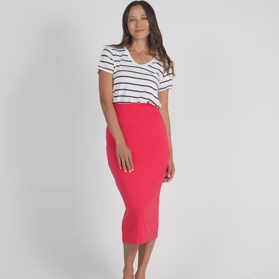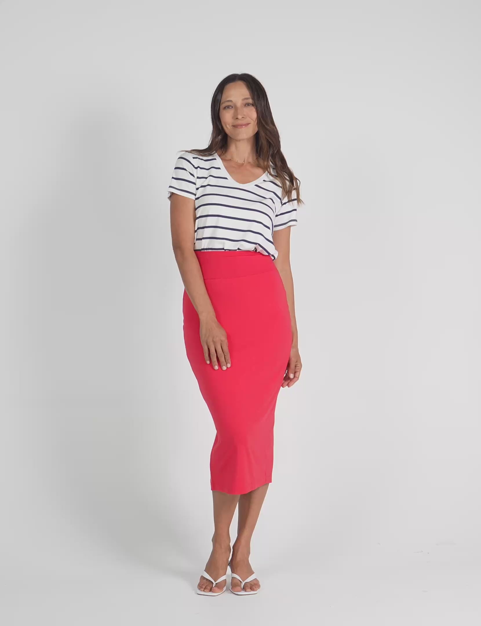 This skirt is ideal for the 9-5, wear with a tucked in shirt, tee or long sleeve top for the smart, work ready look. Or for a casual look, slip on with the Janis Bamboo Tee and your favourite joggers. Also available in mid length.