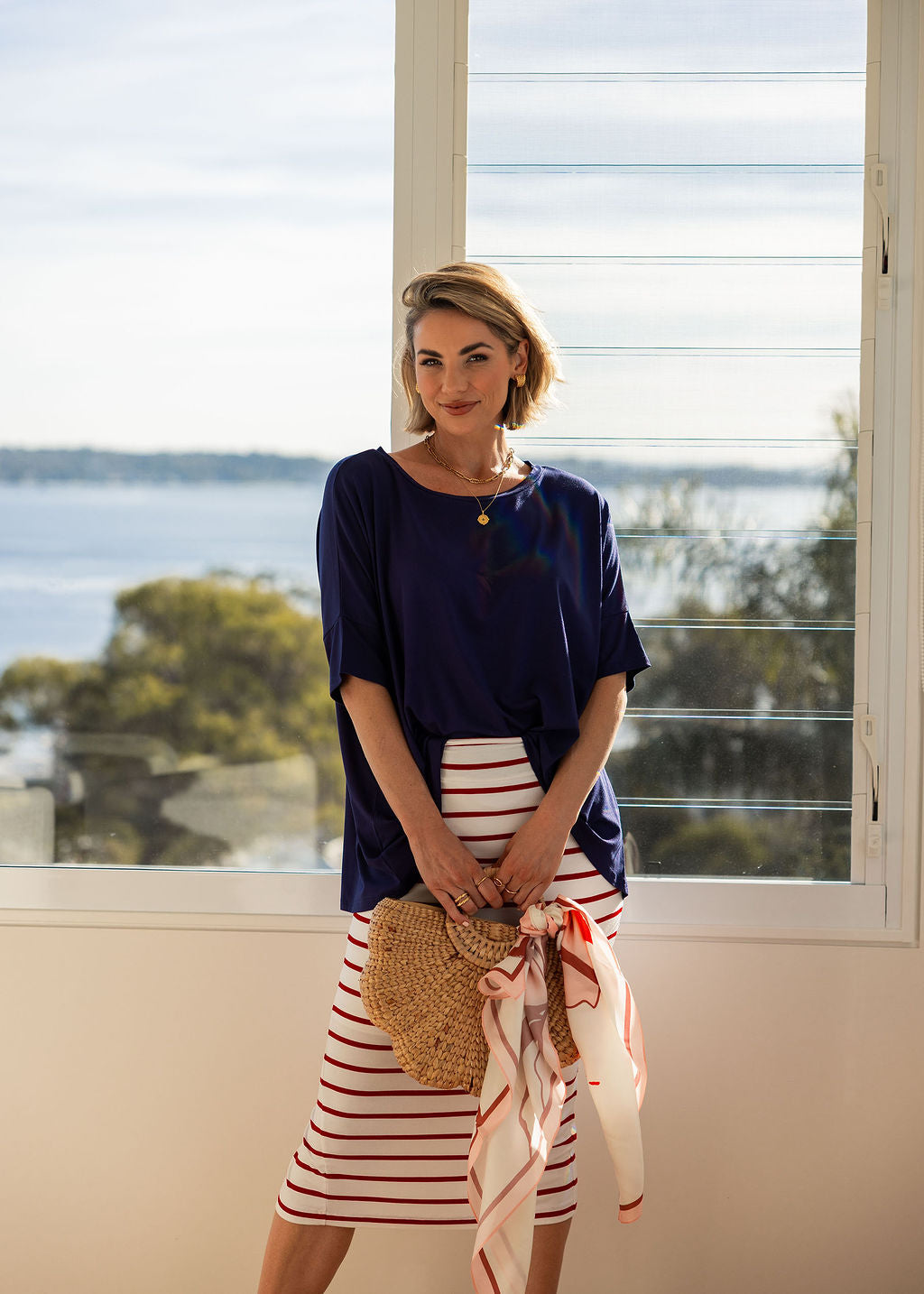 This skirt is ideal for the 9-5, wear with a tucked in shirt, tee or long sleeve top for the smart, work ready look. Or for a casual look, slip on with the Janis Bamboo Tee and your favourite joggers. Also available in mid length.