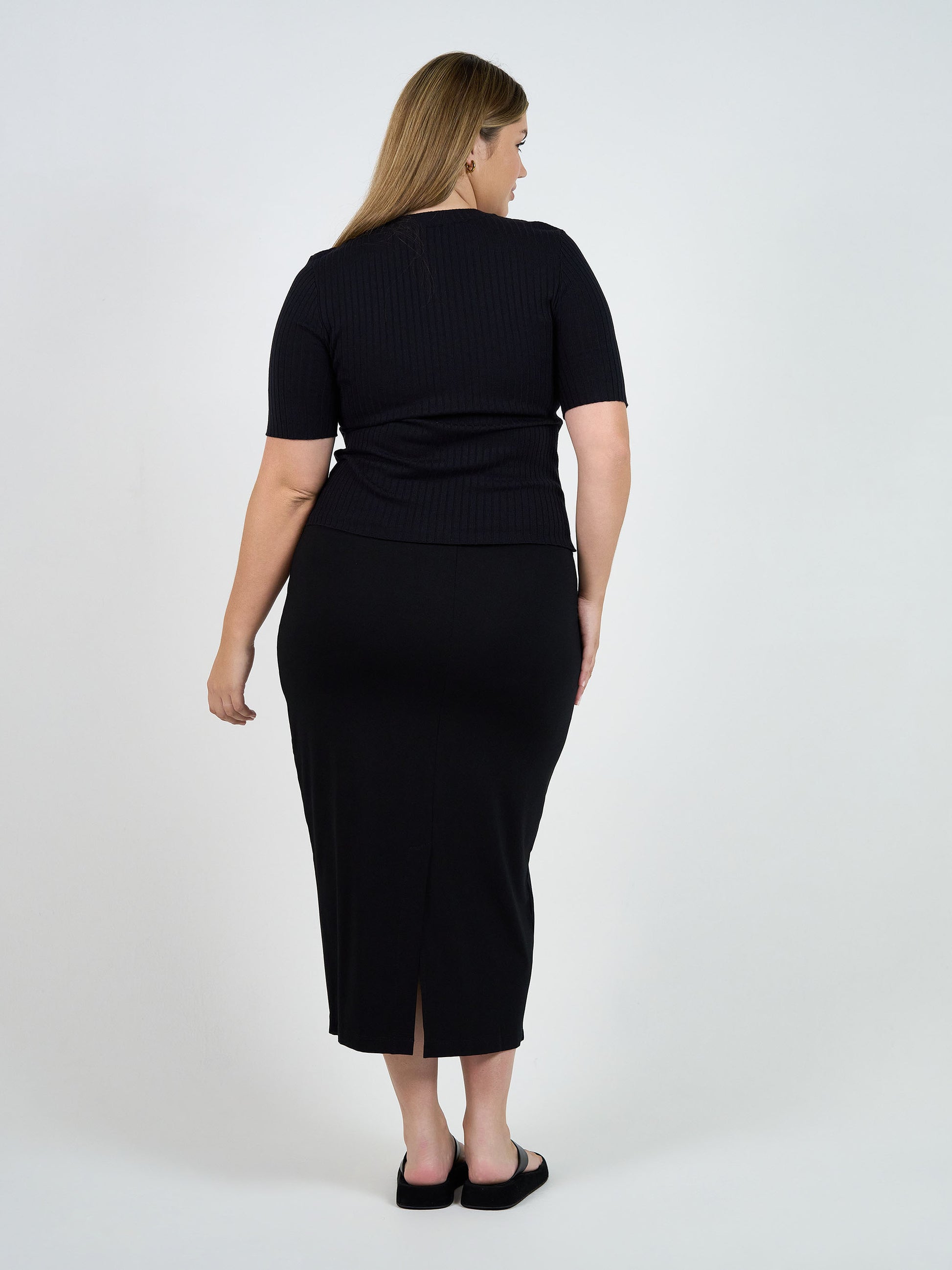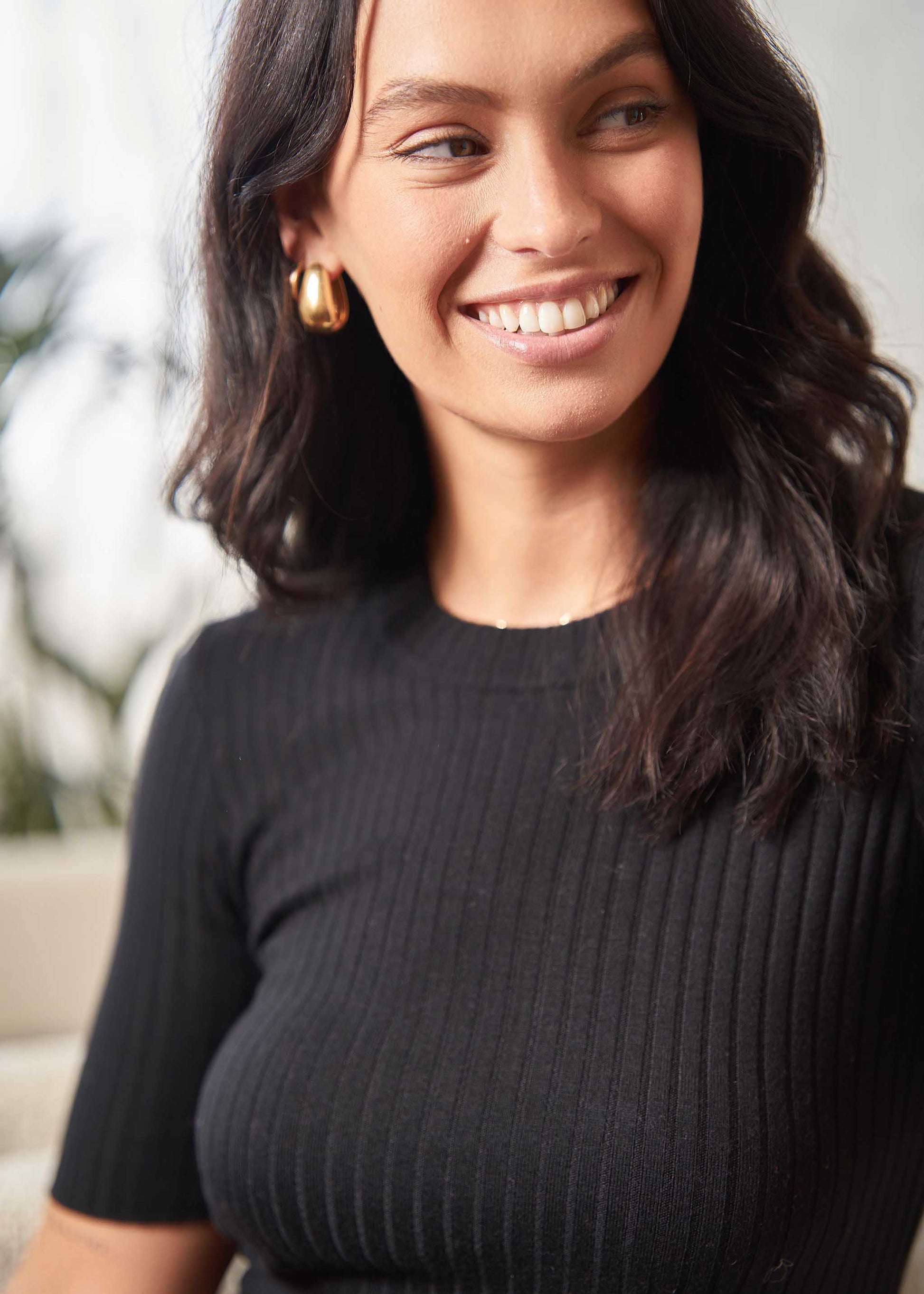 The Olivia Knit Tee is a must have this Winter for layering and will continue to see you through all seasons. This ultra soft Bamboo blend, wide ribbed knit tee features a fitted silhouette, short sleeves and a grown-on collar, slightly higher neckline.