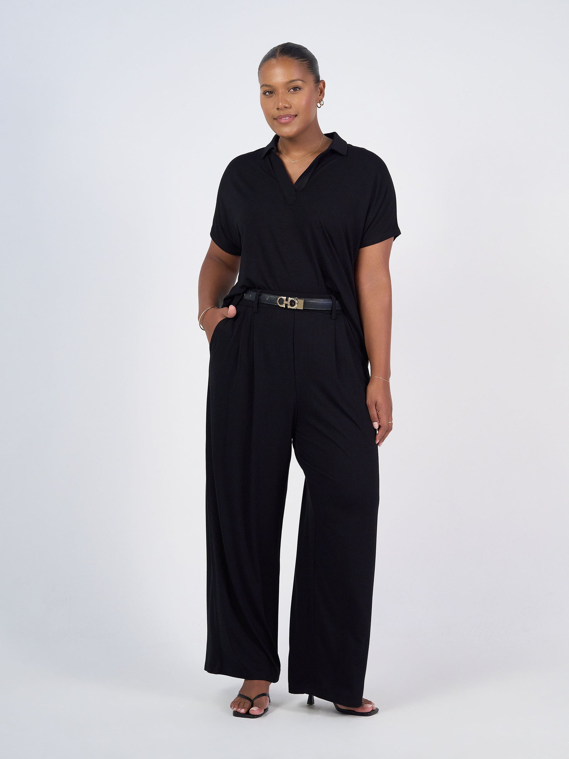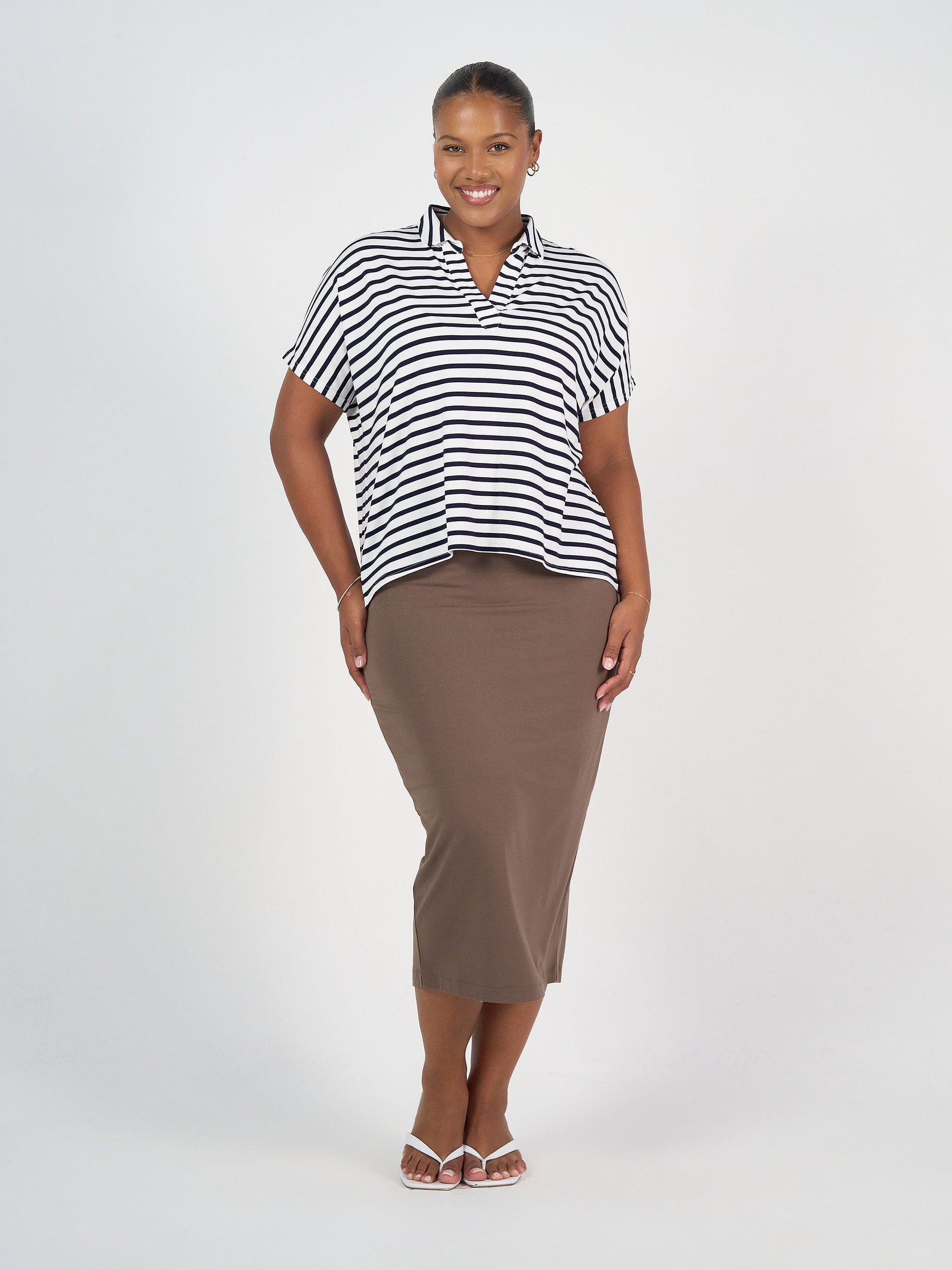 Our new go-to polo! Perfect for travelling, relaxing AND golf days! For those that love our best selling Camila Top, this is the same cut through the body and arm just a different neckline. This is a lovely and stretchy style made with our signature, luxuriously soft bamboo fabric. Featuring a v-neck and collar, short sleeves and relaxed box fit with gentle curved hem at back. You are going to LOVE this one! This top offers casual style with a touch of sophistication. This versatile top is made to flatter not too loose and not too tight.