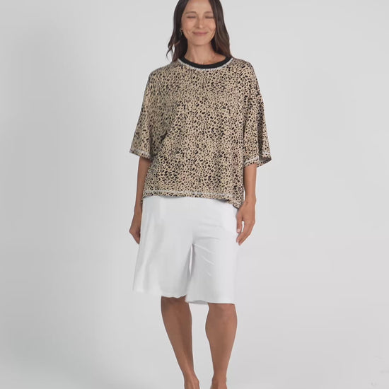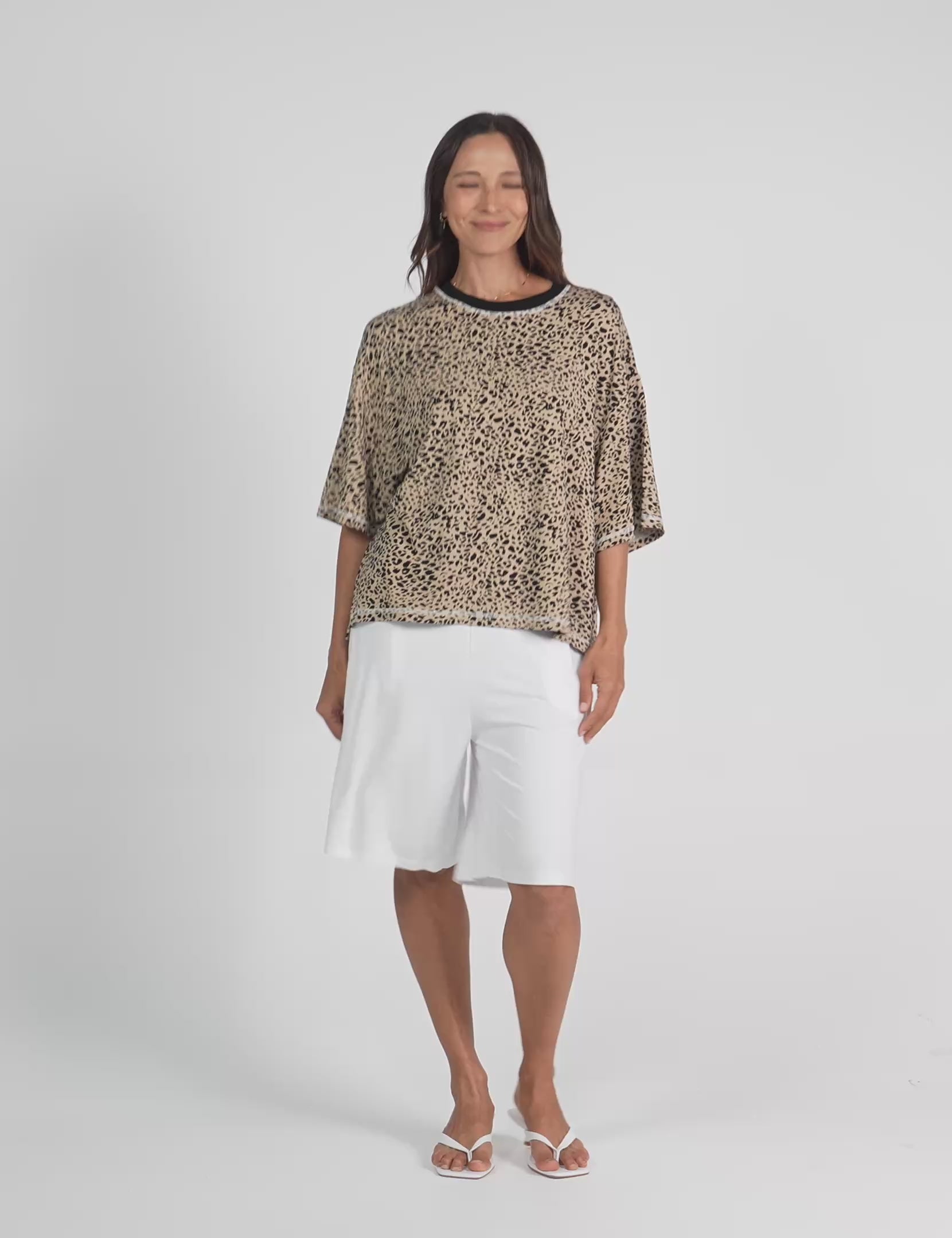 Versatile go-to bamboo tee that feels heavenly against your skin. This tee has a boxy draped fit finishing at the hip with short wide sleeves and crew neckline. Featuring a stepped hem with side slits and exposed stitching detail.