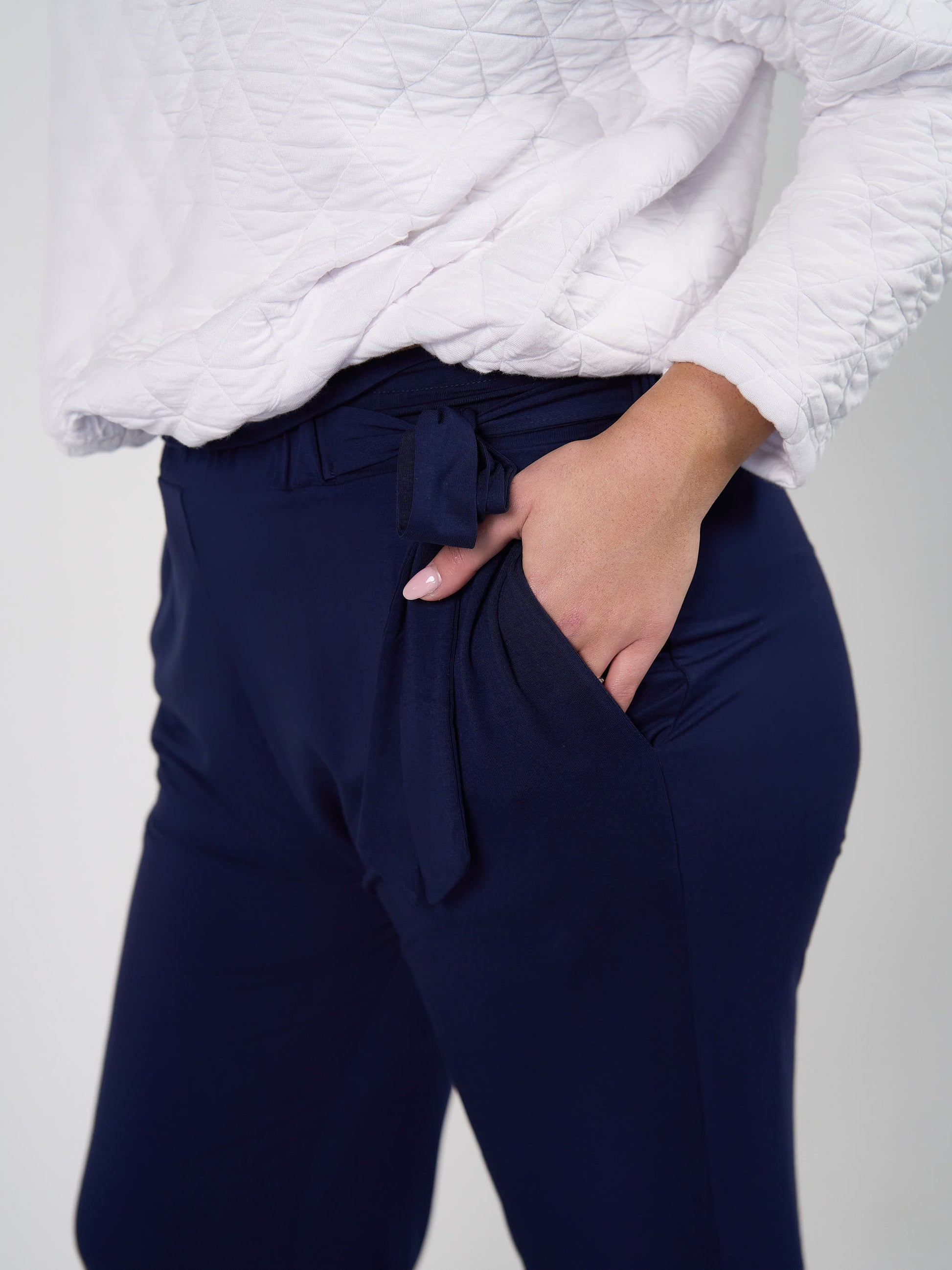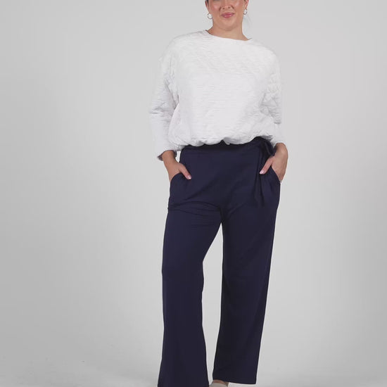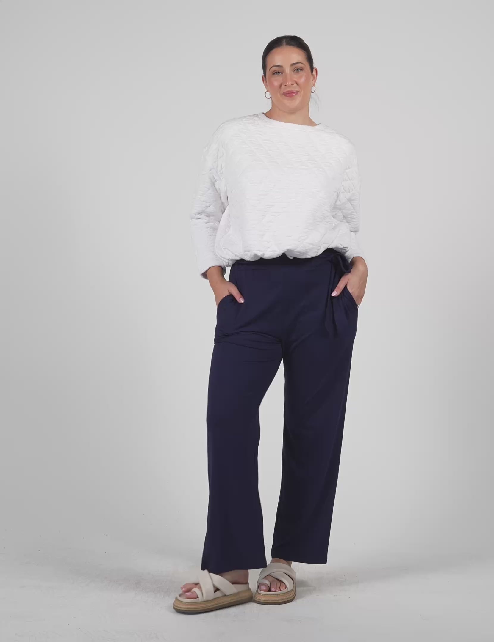 A contemporary pant made for work and lounging. Featuring a wide, 7/8 long leg with elastic paperbag waist band with decorative side tie. Pockets for comfort and practicality! These pants look fabulous with one of our tees tucked in or a cami with heels for a night out!