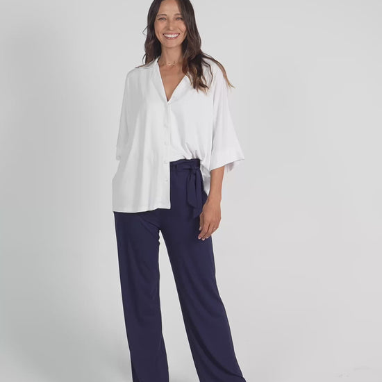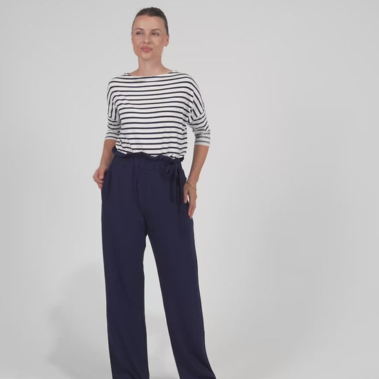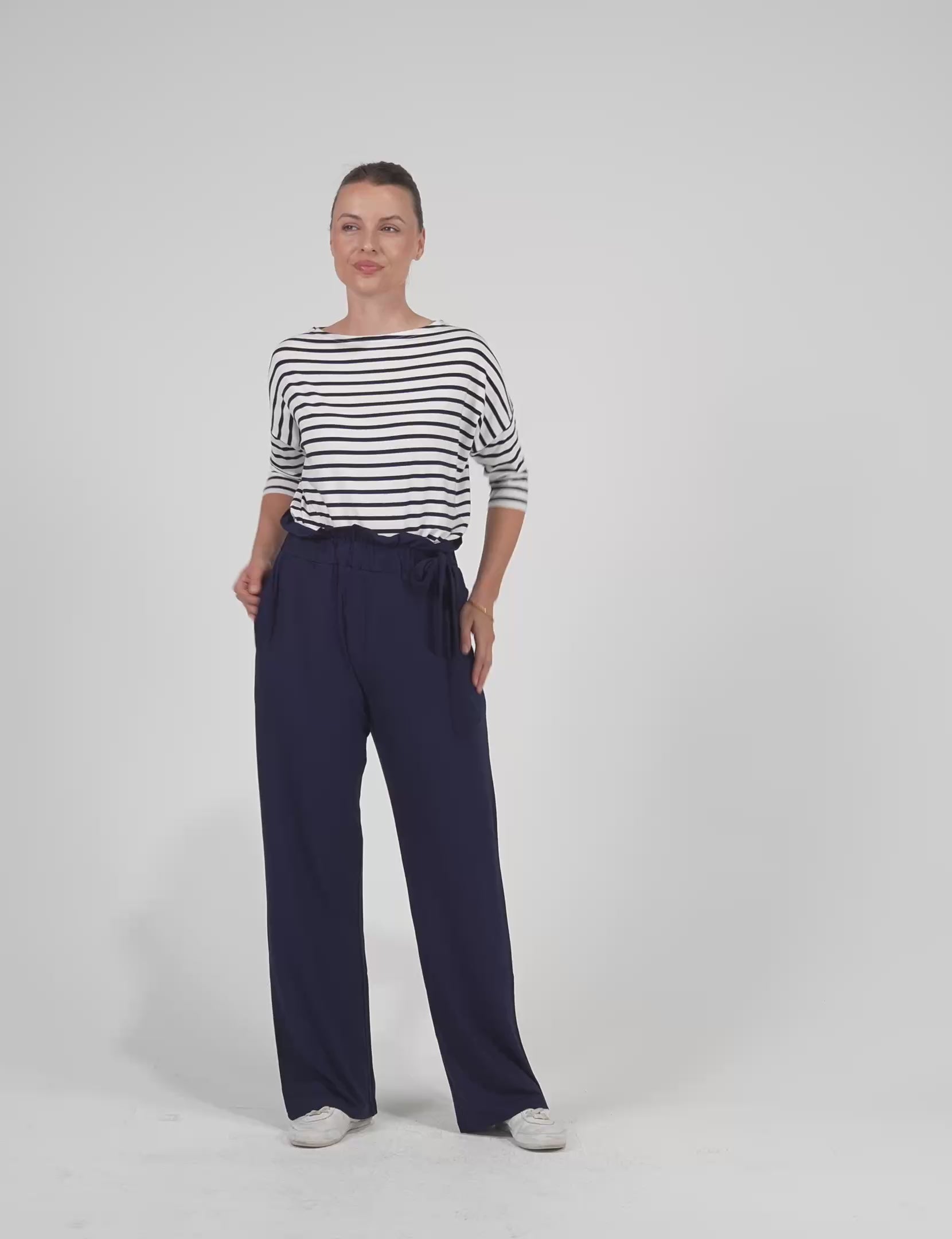 A contemporary pant made for work and lounging. Featuring a wide, 7/8 long leg with elastic paperbag waist band with decorative side tie. Pockets for comfort and practicality! These pants look fabulous with one of our tees tucked in or a cami with heels for a night out!