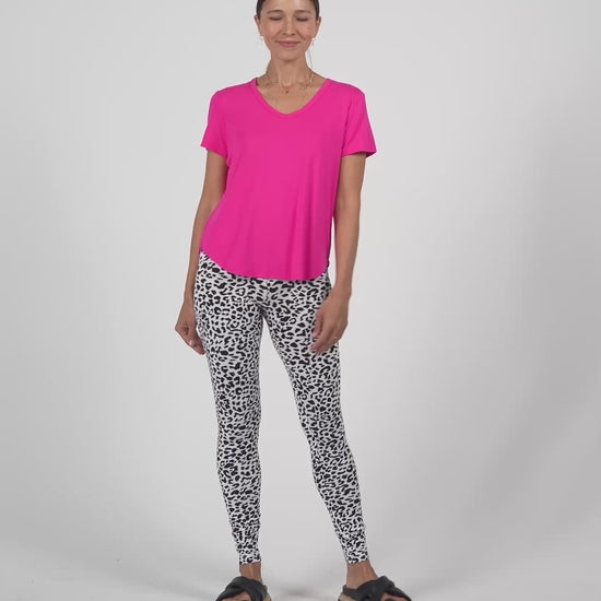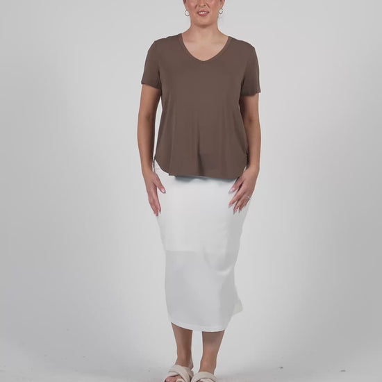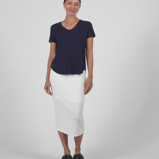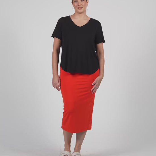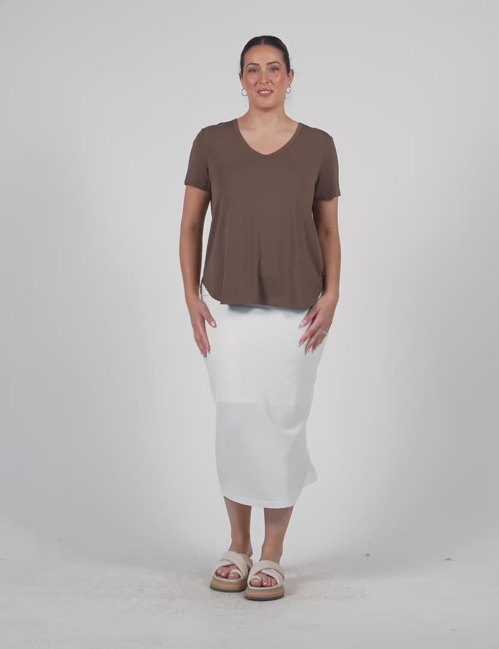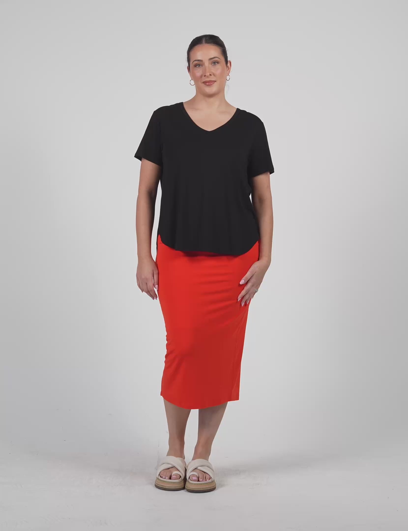 This versatile and comfortable Bamboo T Shirt long V neckline is a wardrobe essential. Crafted in our custom made, luxuriously soft, stretchy & breathable Bamboo fabric for ultimate comfort. This tee floats around your body. With its subtle V Neck we will have you feeling effortlessly glamorous. You’ll want one in every colour!